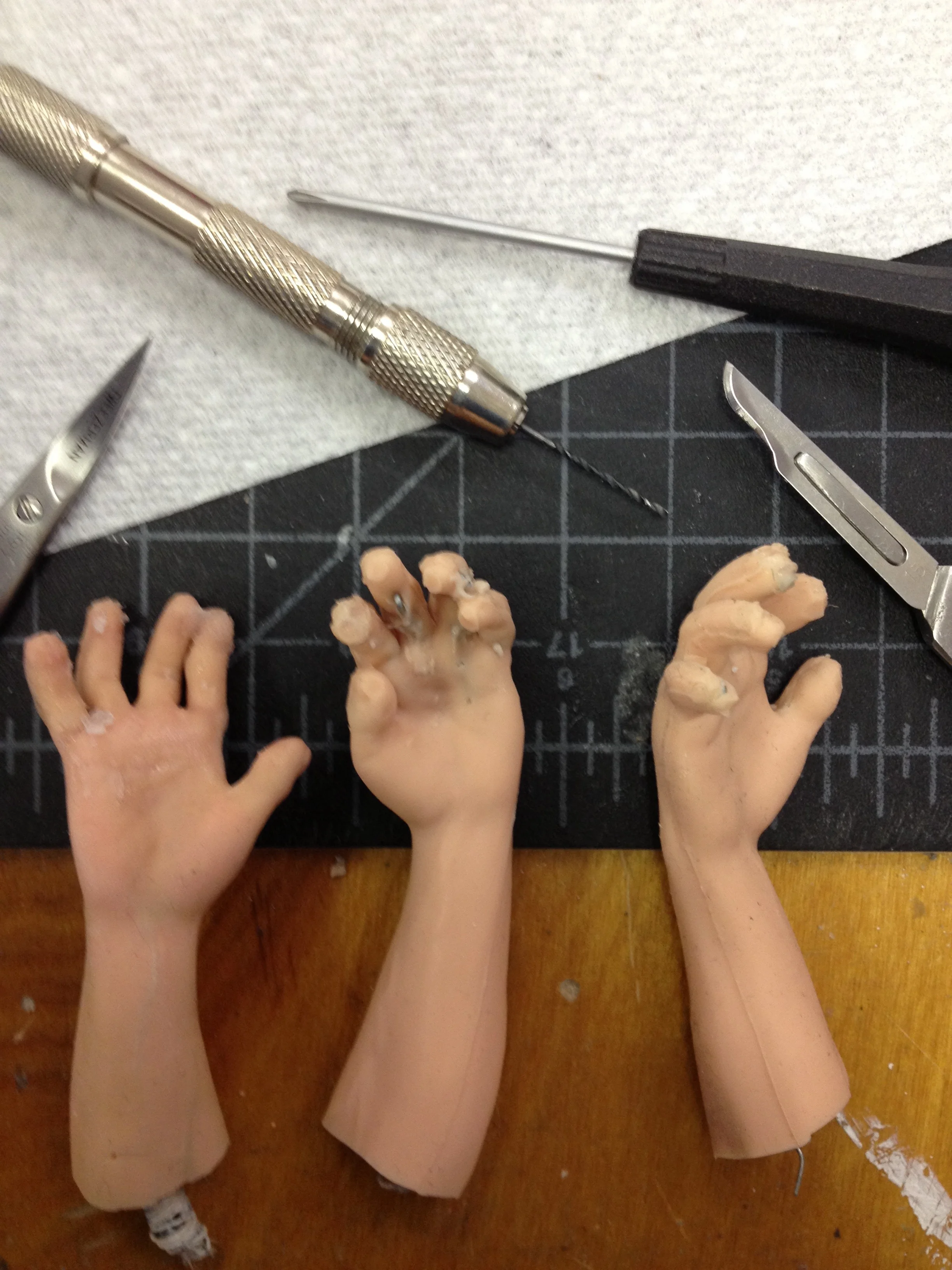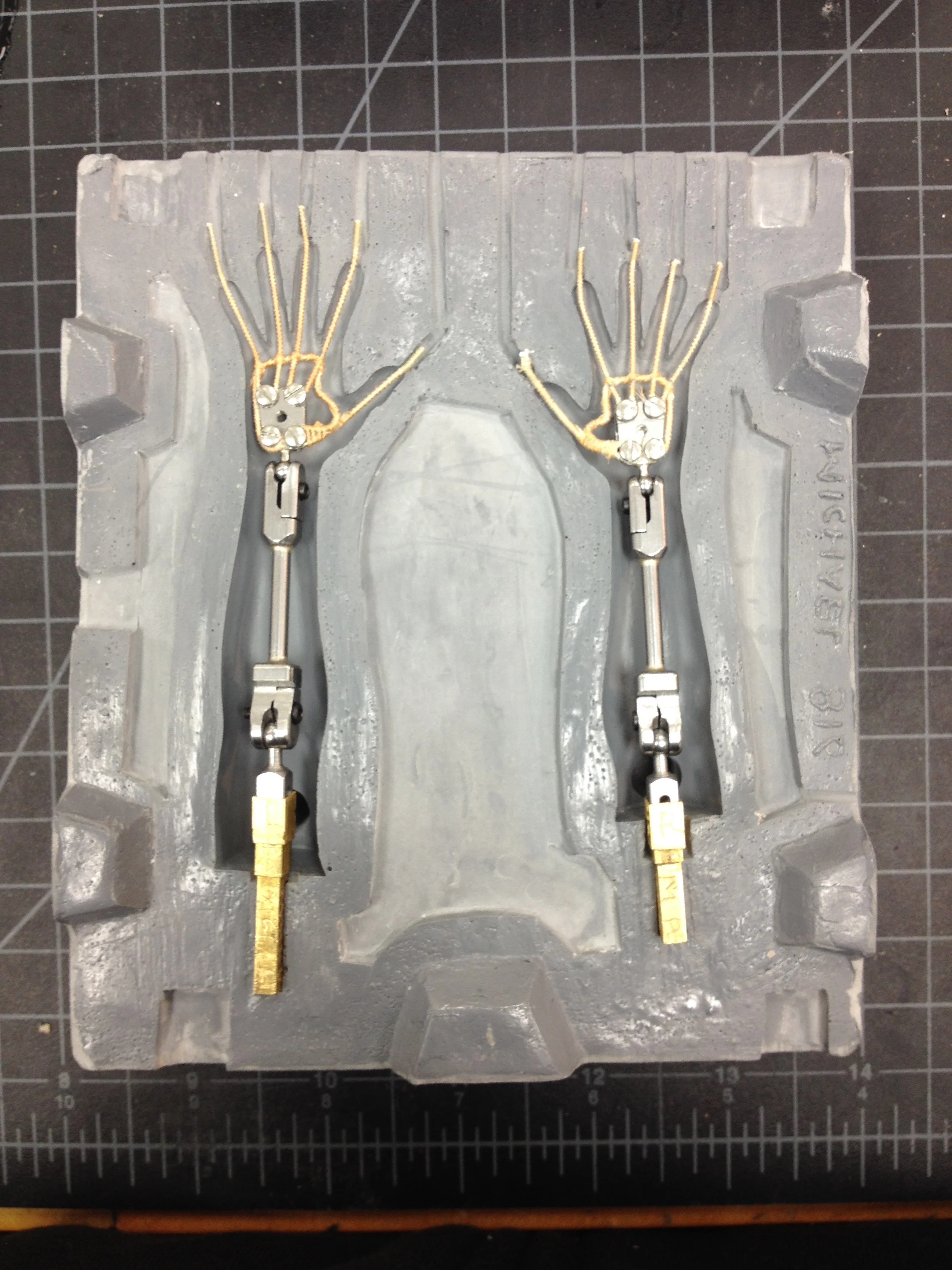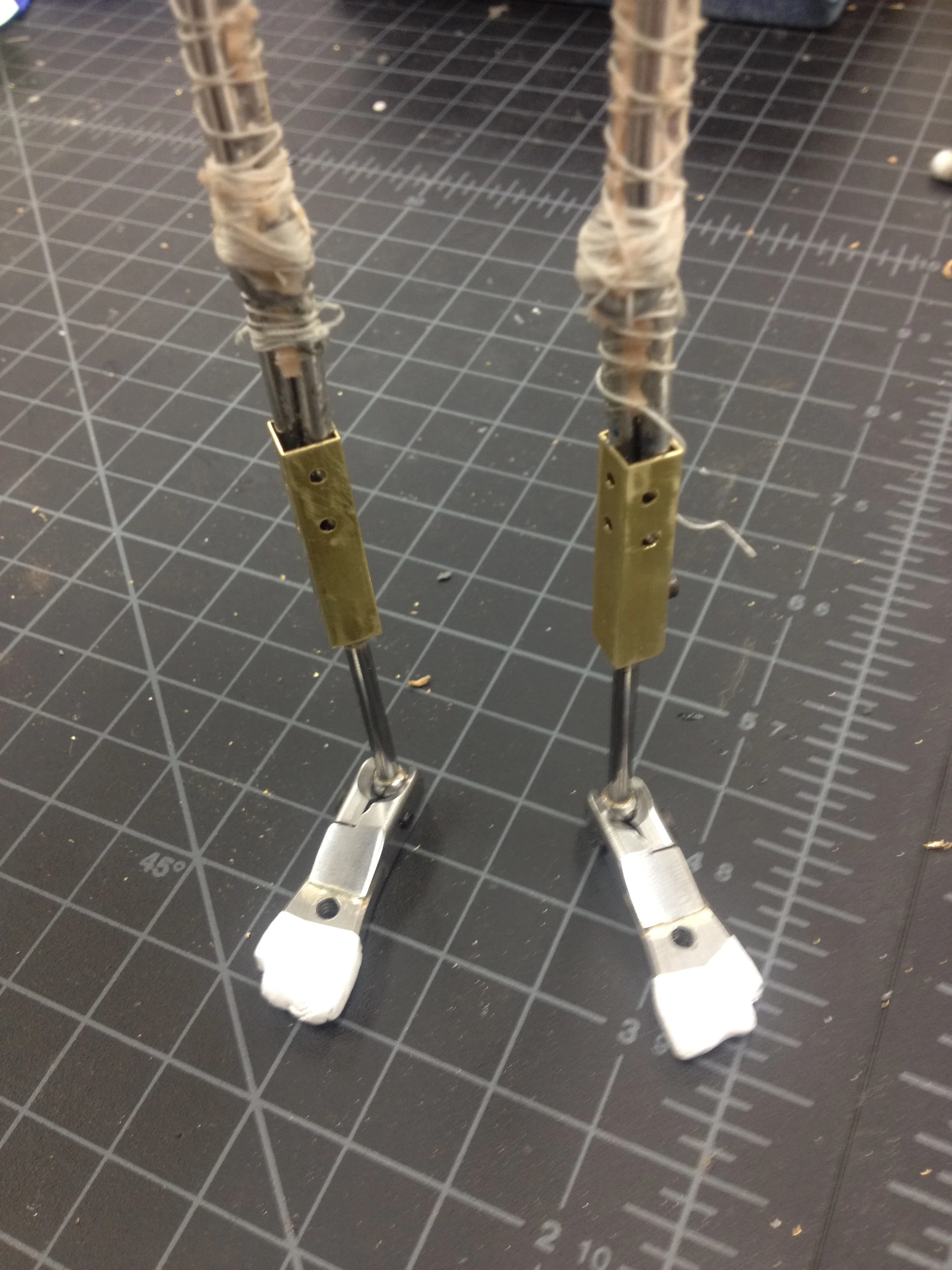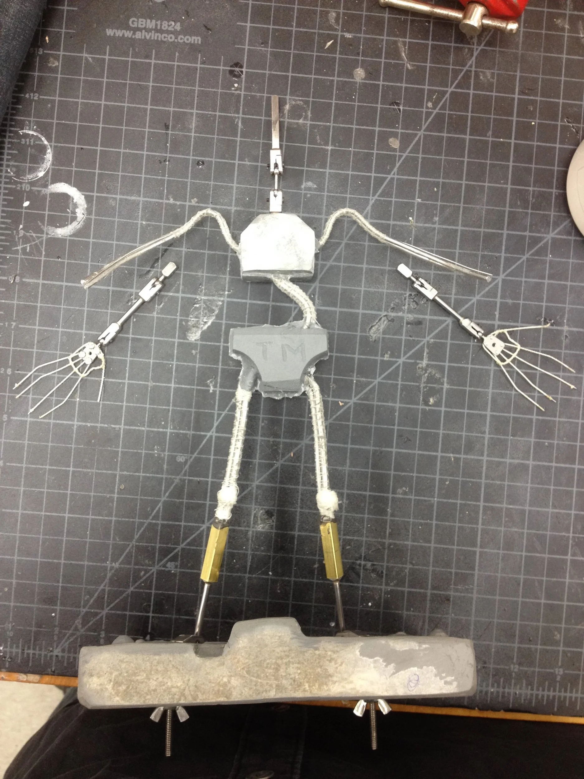 Originally those two main characters were constructed the same way as the "extras"; wire armature with an epoxy body block, brass stock sockets for replacing hands when broken and a 3-D printed "Headcore" that received the 2 halves of the faceplates used to give the characters their expressions and realistic phonetic mouth movements, frame by frame. When they found that this design was fine for the background characters with little action or screen time, it was beginning to cause near catastrophic problems on set for the main characters. Breakage of the composite wire systems were increasing and general fatigue was wearing down the strength of the wire based puppets.